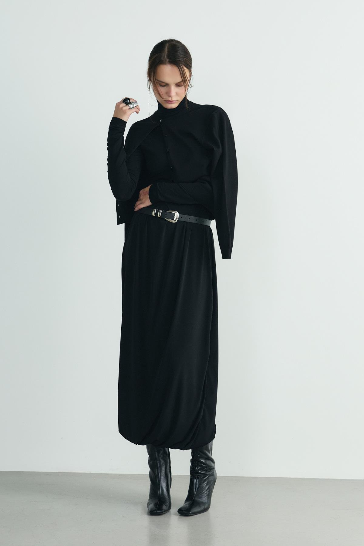 Lastikli beli ve balon kesimi ile her bedene uyum sağlayan Emma Midi Etek, hacimli formu ve dökümlü yapısıyla sezonun en iddialı parçalarından biri. Görünümünü Boğazlı Tensel Body ile tamamla.