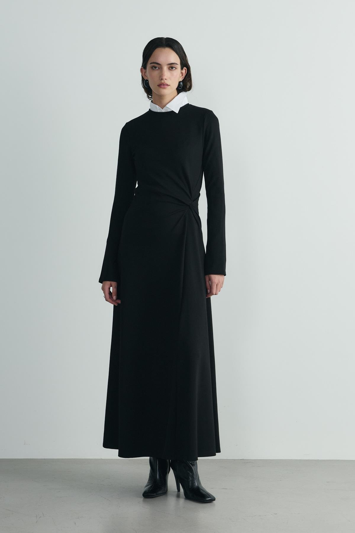 Sezonsuz ve zamansız Norena Düğümlü Midi Elbisenin kloş kesimi rahat hareket etmeni sağlar. Elbisenin belindeki düğüm vücudunu daha şekilli gösterir. Görünümünü Penny Basic Gömlek ile tamamla.