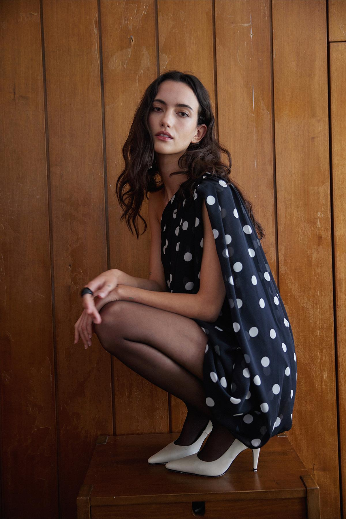 Puantiyeli Mini Balon Elbise, Omuz kısmındaki büzgü detayı ve hacimli balon kesimi ile doğal bir zarafet ve akıcı bir duruş sunar.